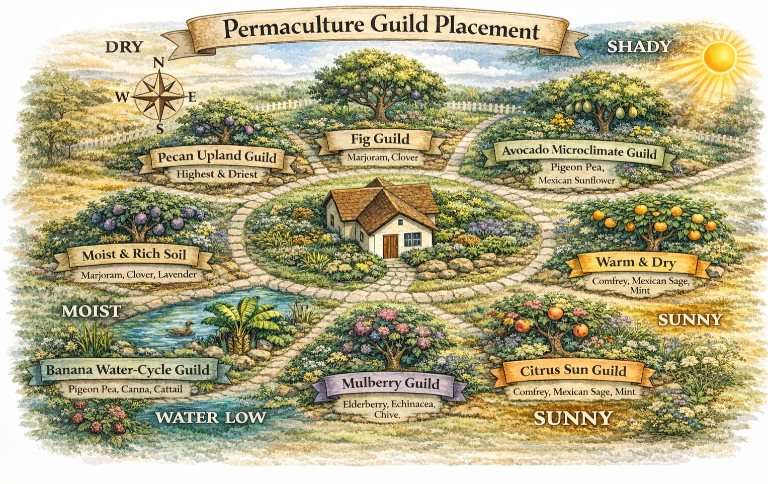 A guild is a living partnership, a circle of plants that feed the soil and help each other grow strong. By building nutrient-rich foundations, we can grow resilient gardens that provide hearty, year-round harvests. See our Client Guide PDF to view guild options suited for zones 9a and 9b.